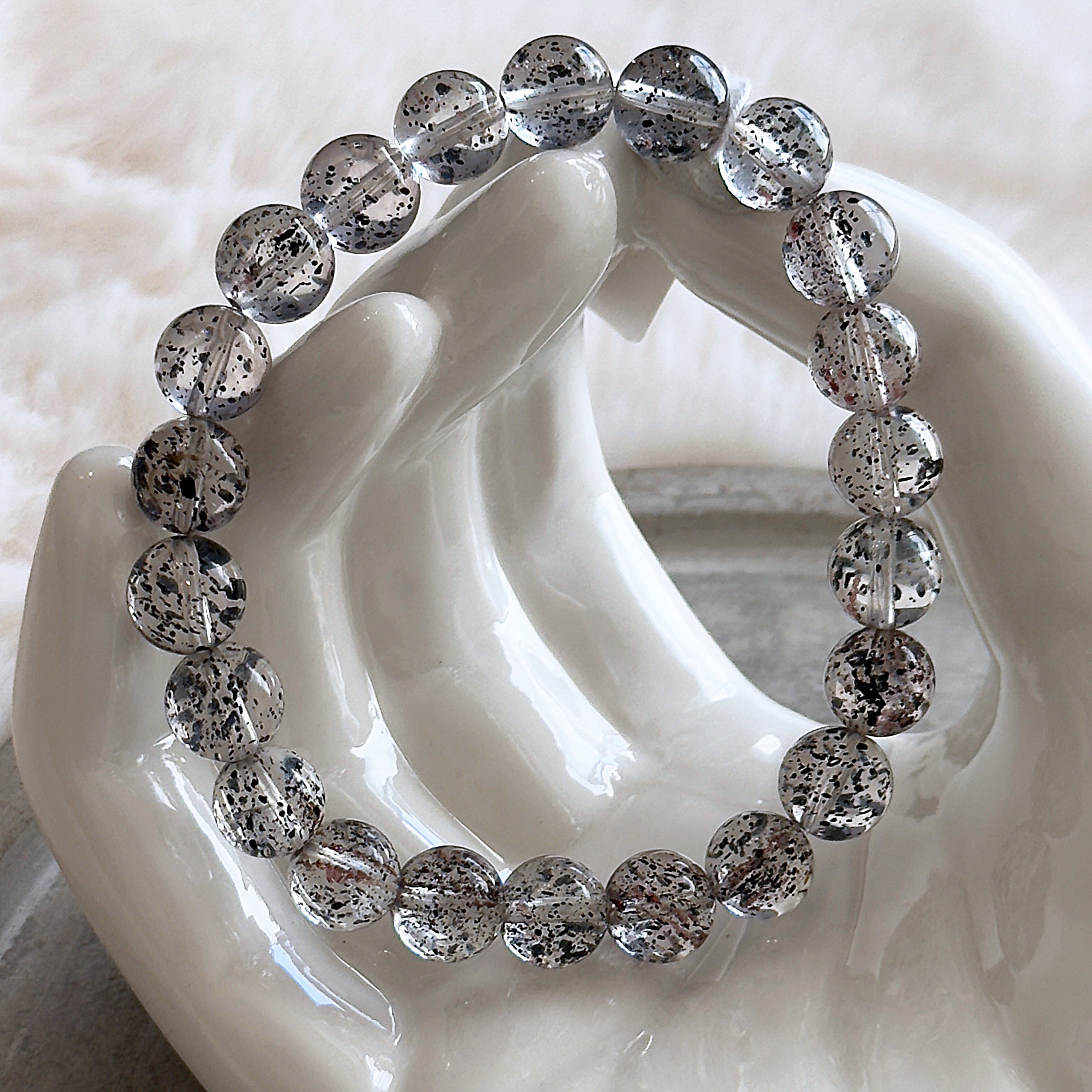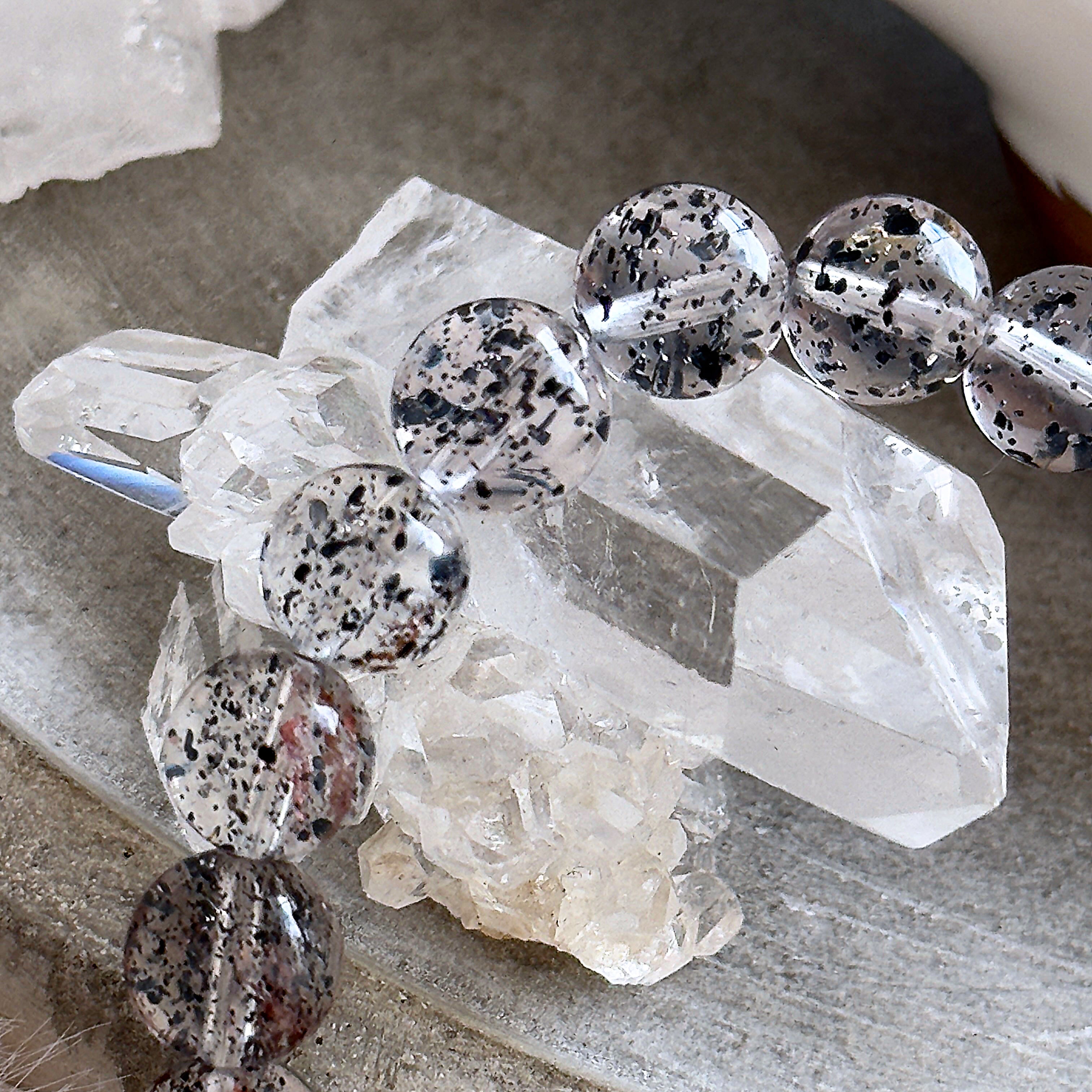 黒苺晶と言われ、透明感の高い水晶に雲母のような黒い内包物がキラキラと煌めきます。