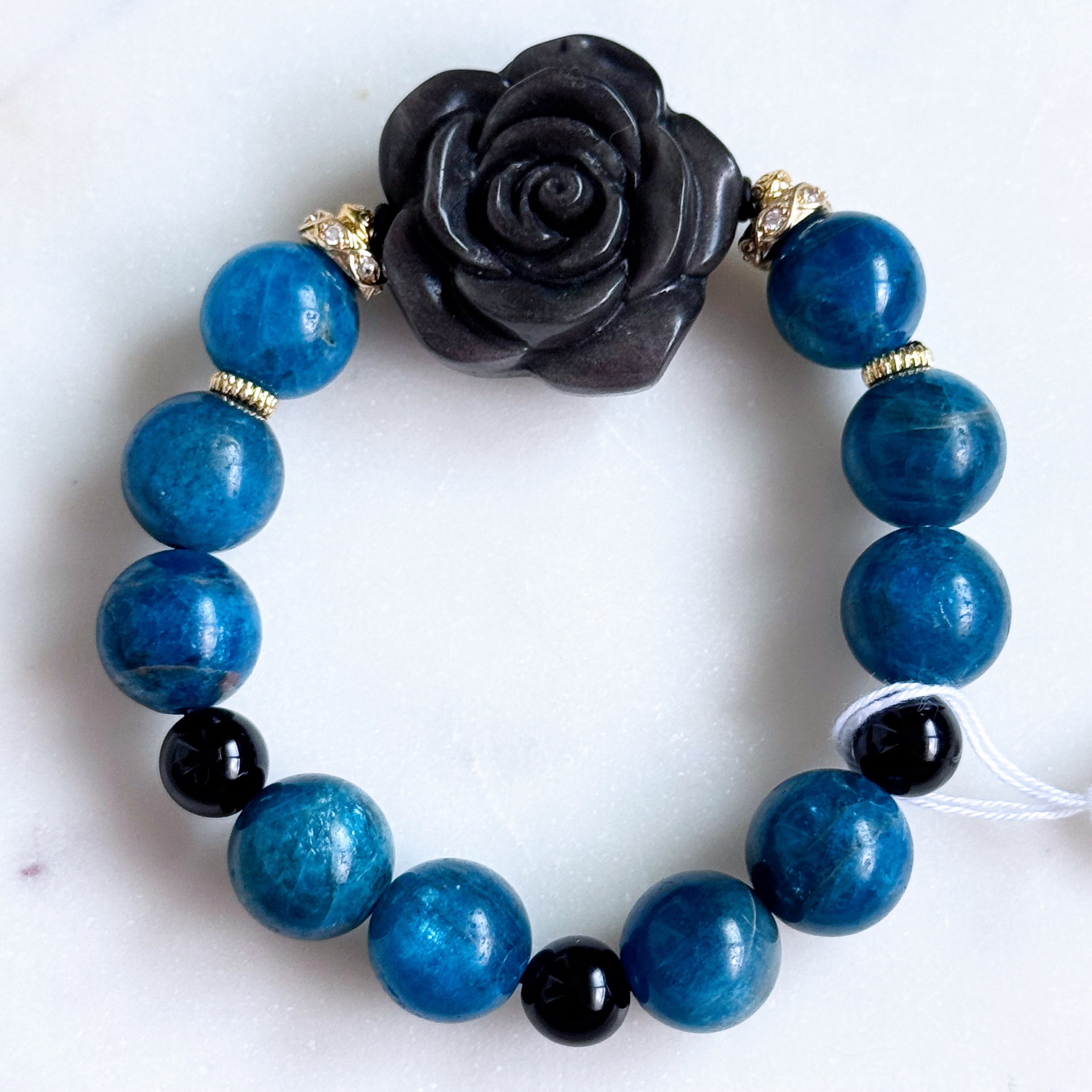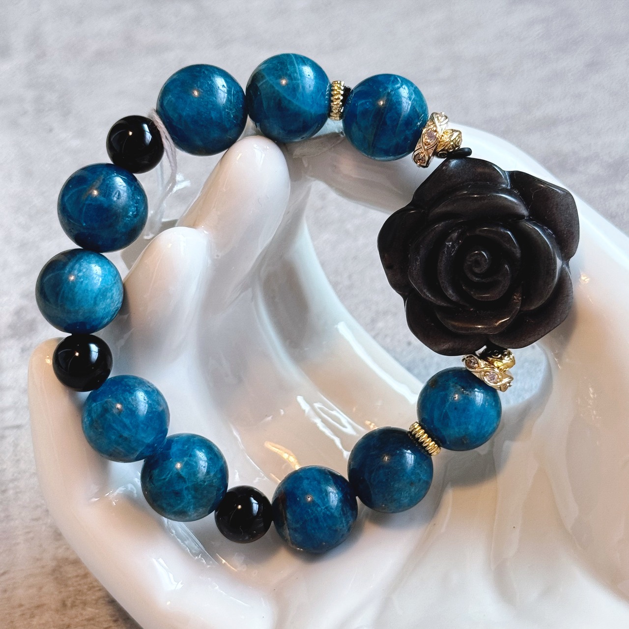 闇を映すオブシディアンの「薔薇」と、鮮やかなブルーが印象的なアパタイトを組み合わせた天然石ブレスレット。
