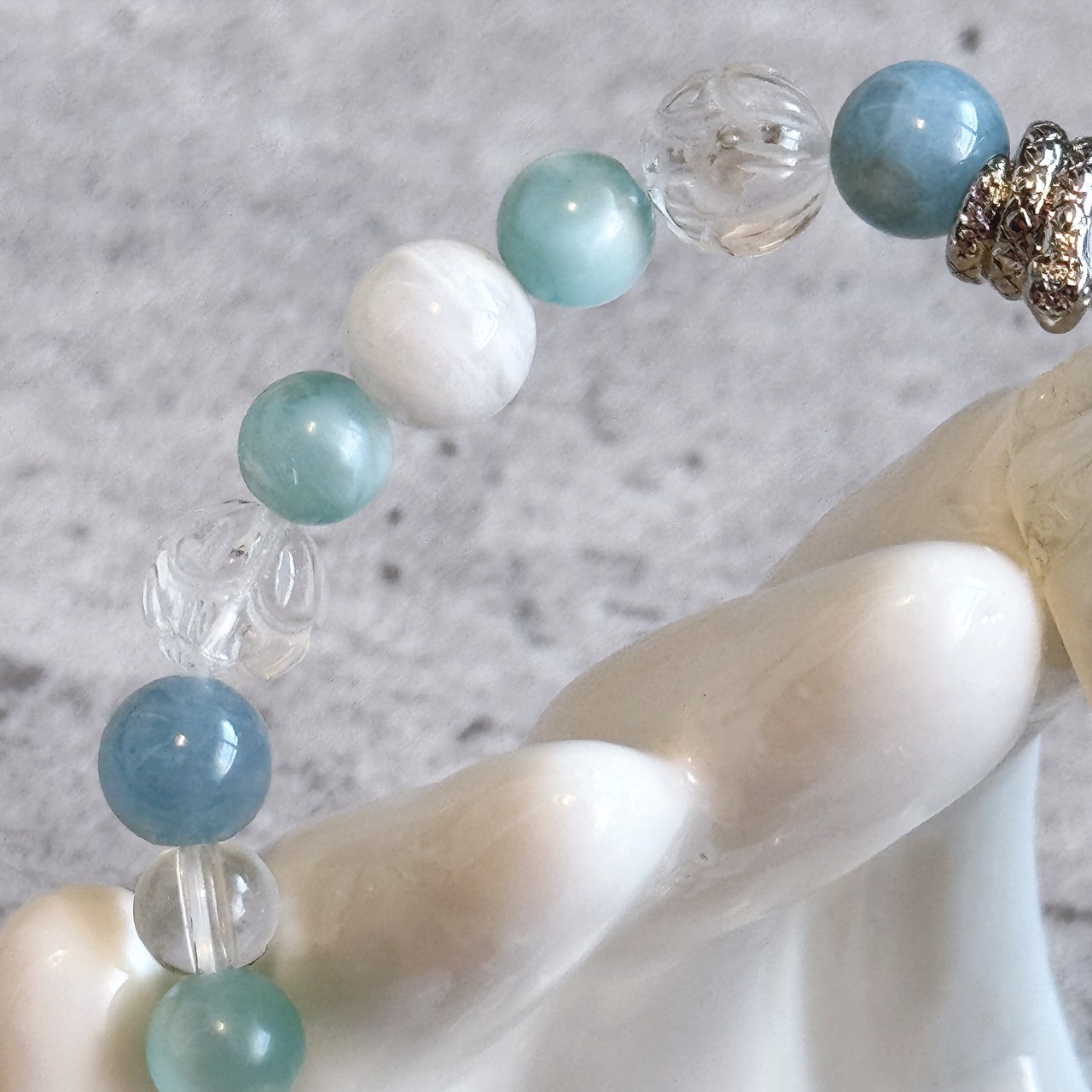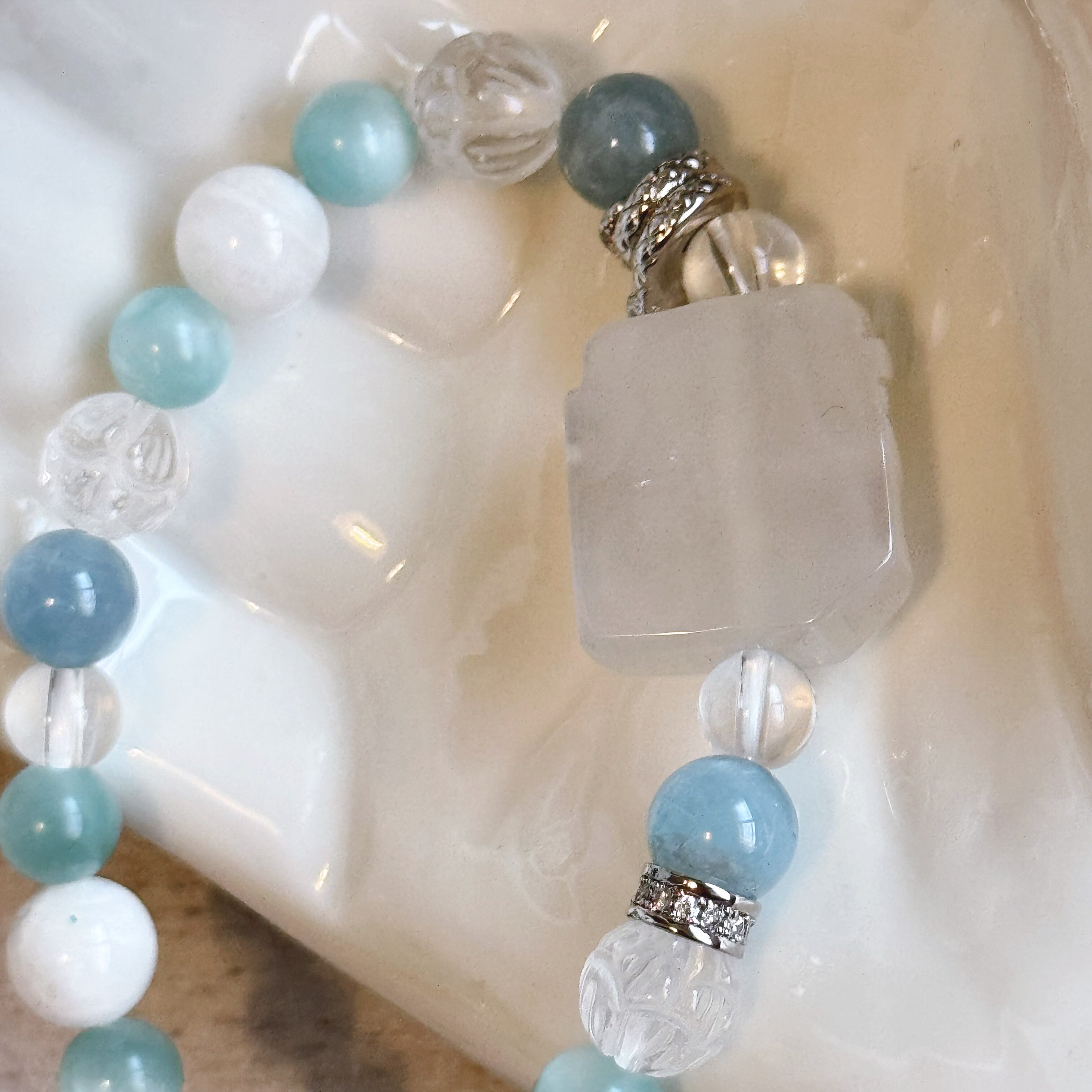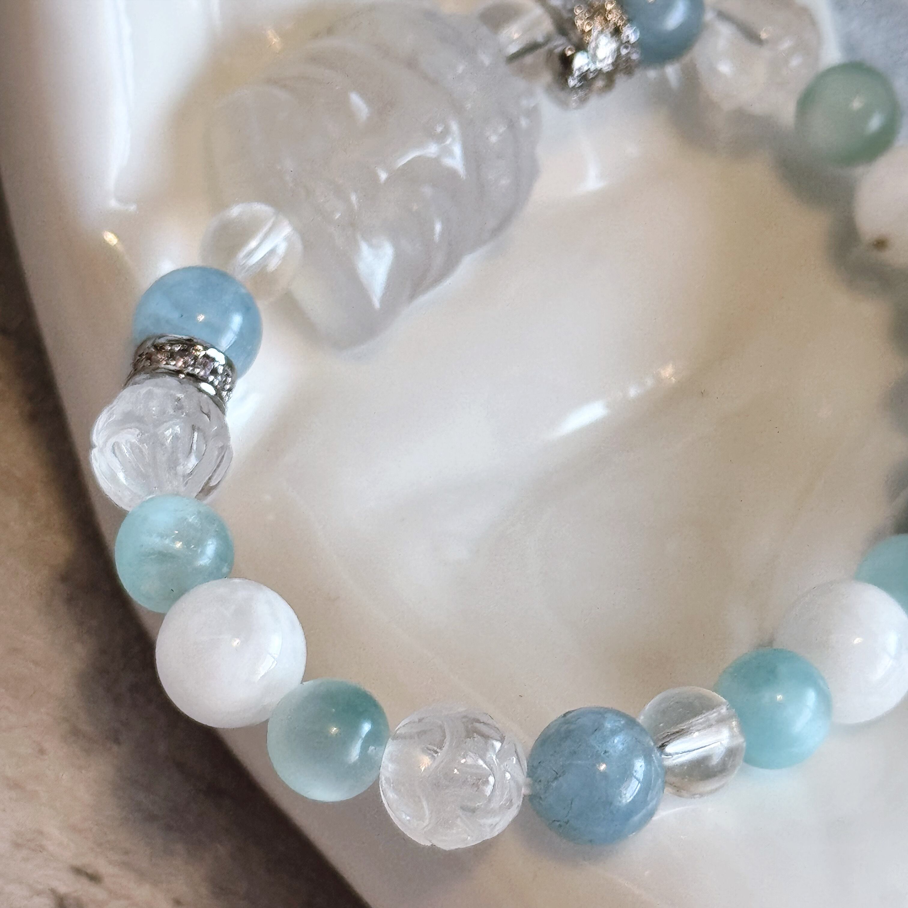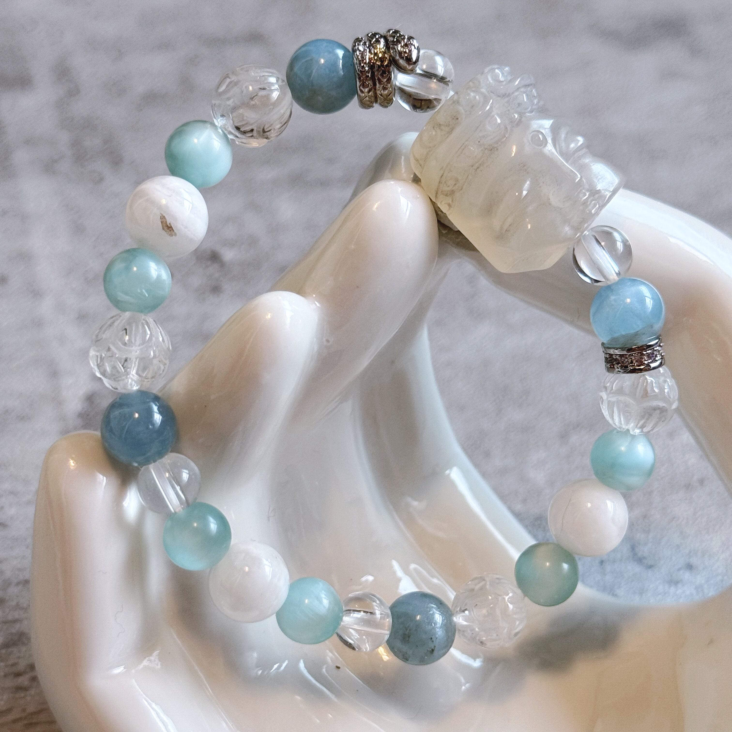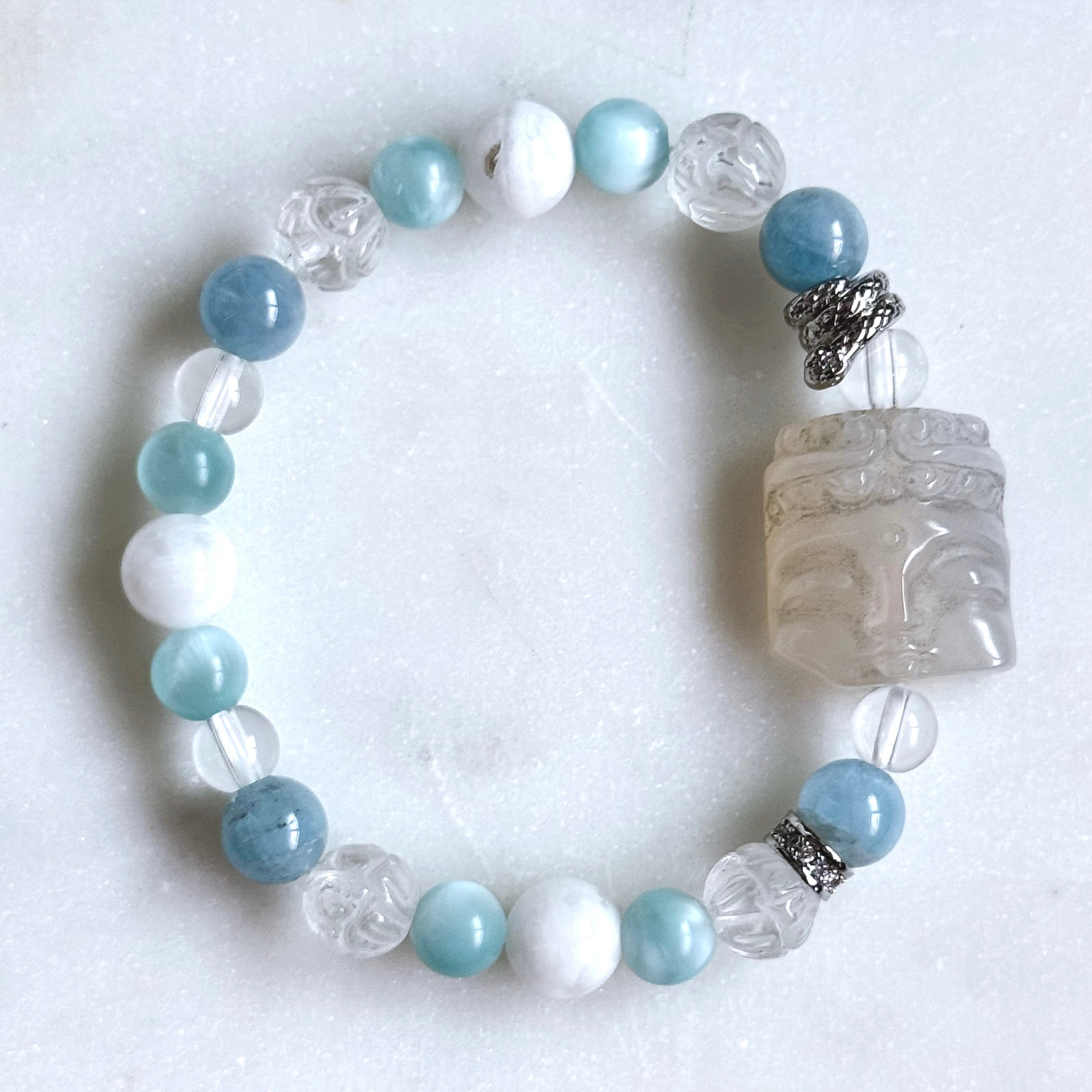 ホワイトカルセドニーの仏陀ご尊顔と、アクアマリン、セリサイトインクォーツを組み合わせた天然石ブレスレット。