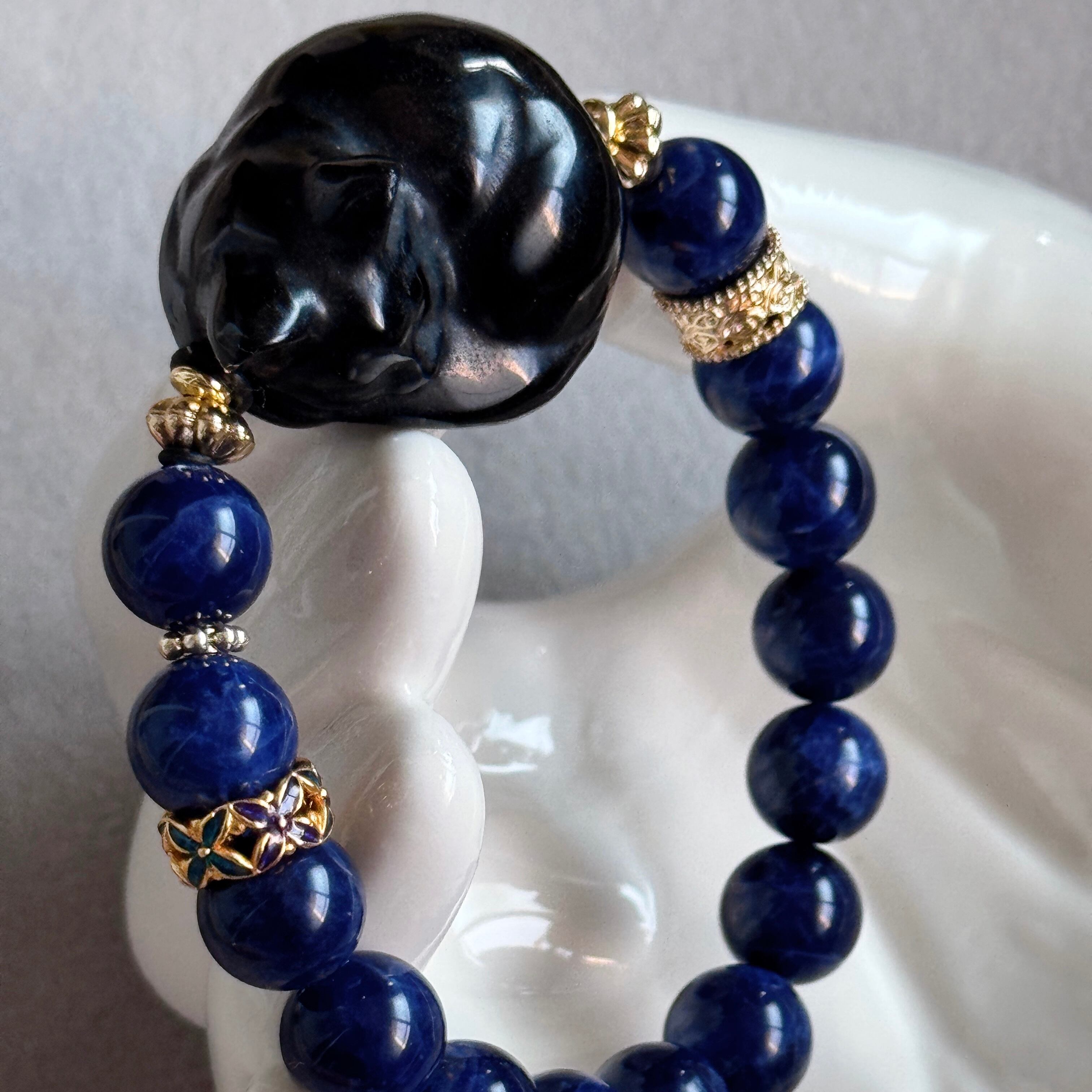 宵闇に静かに眠るオブシディアンの黒猫に、ソーダライトを合わせたブレスレット。