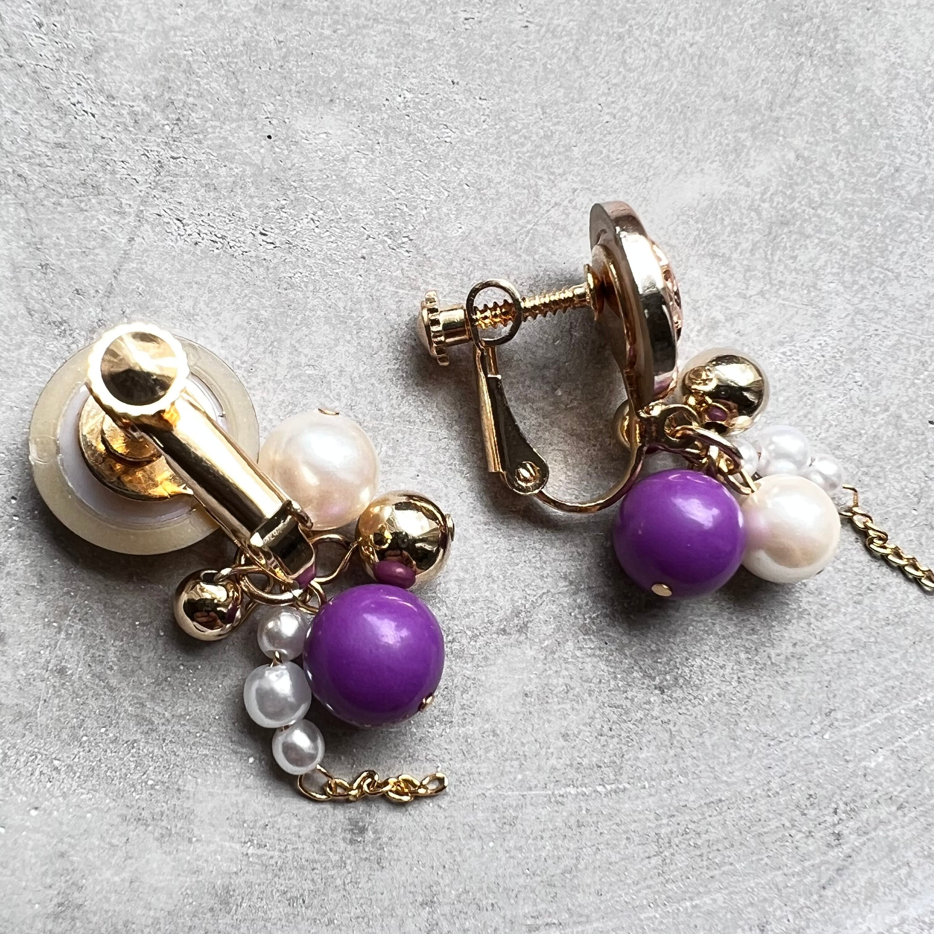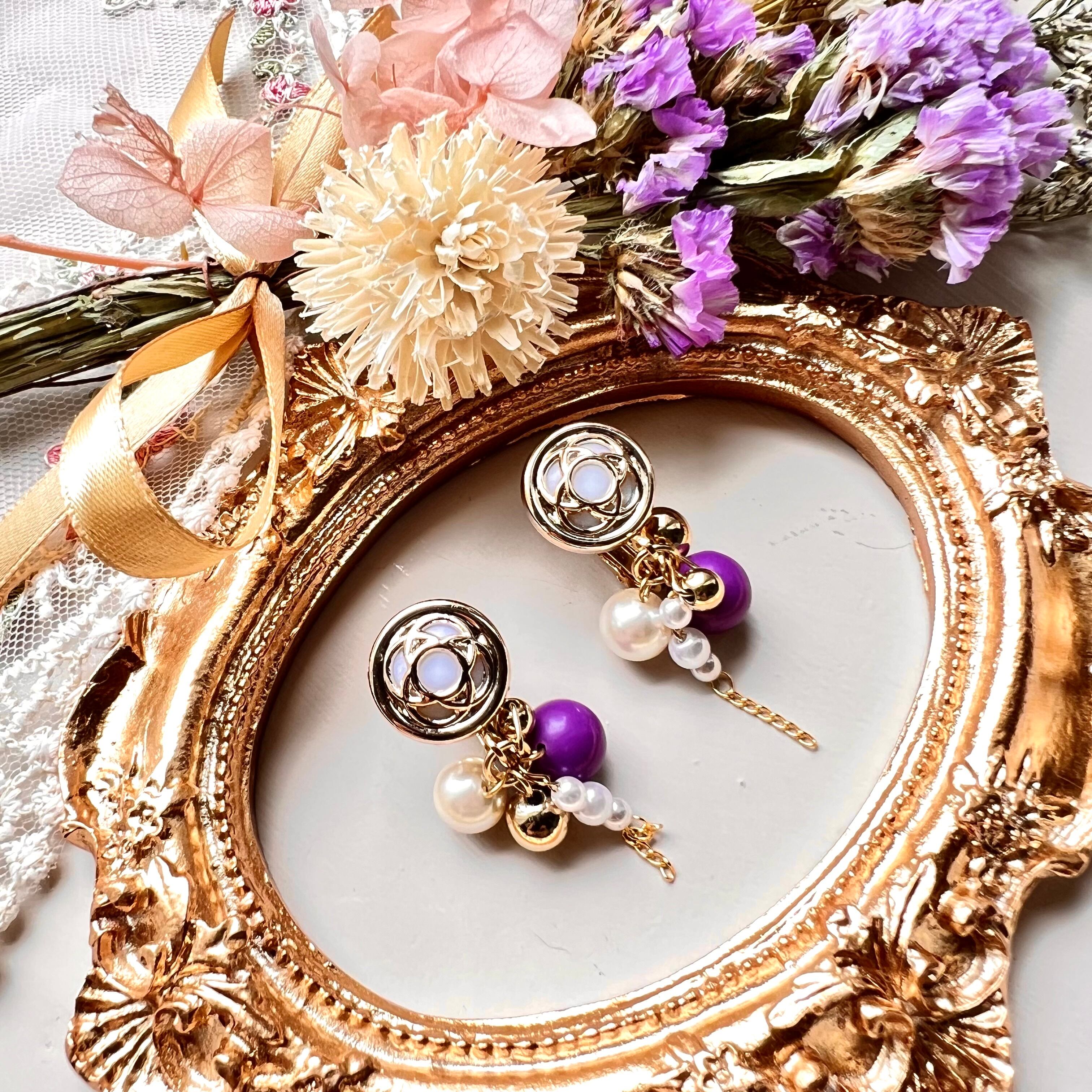 華やかなアンティークボタンを使ったフォスフォシデライトとパールのゴールドイヤリング