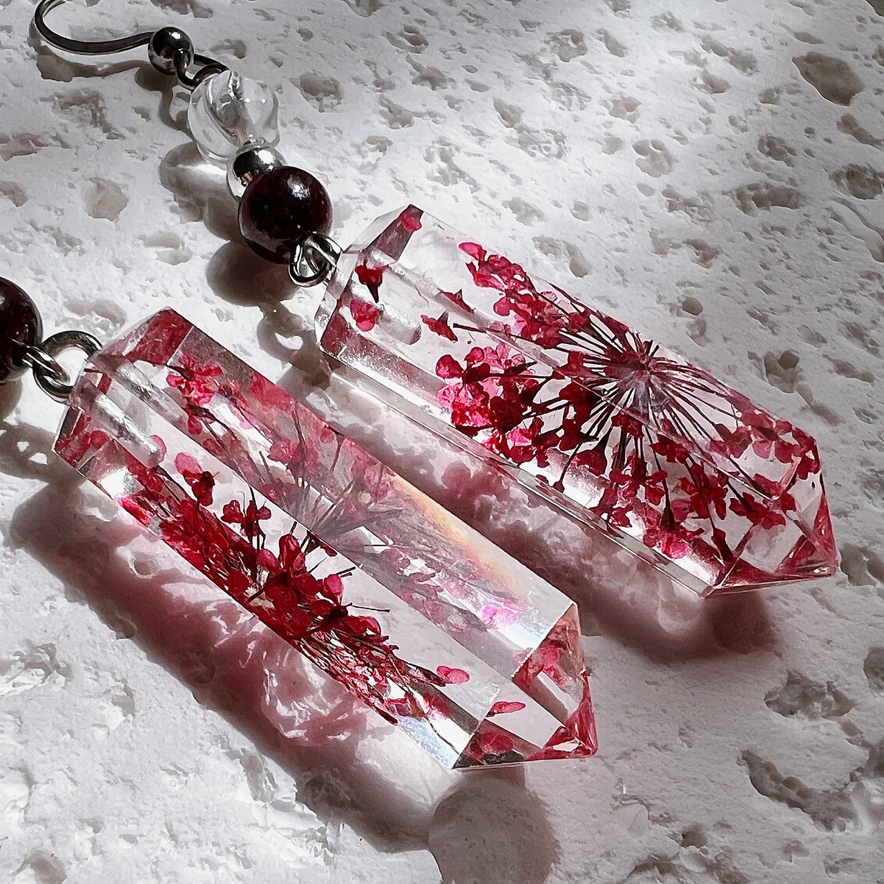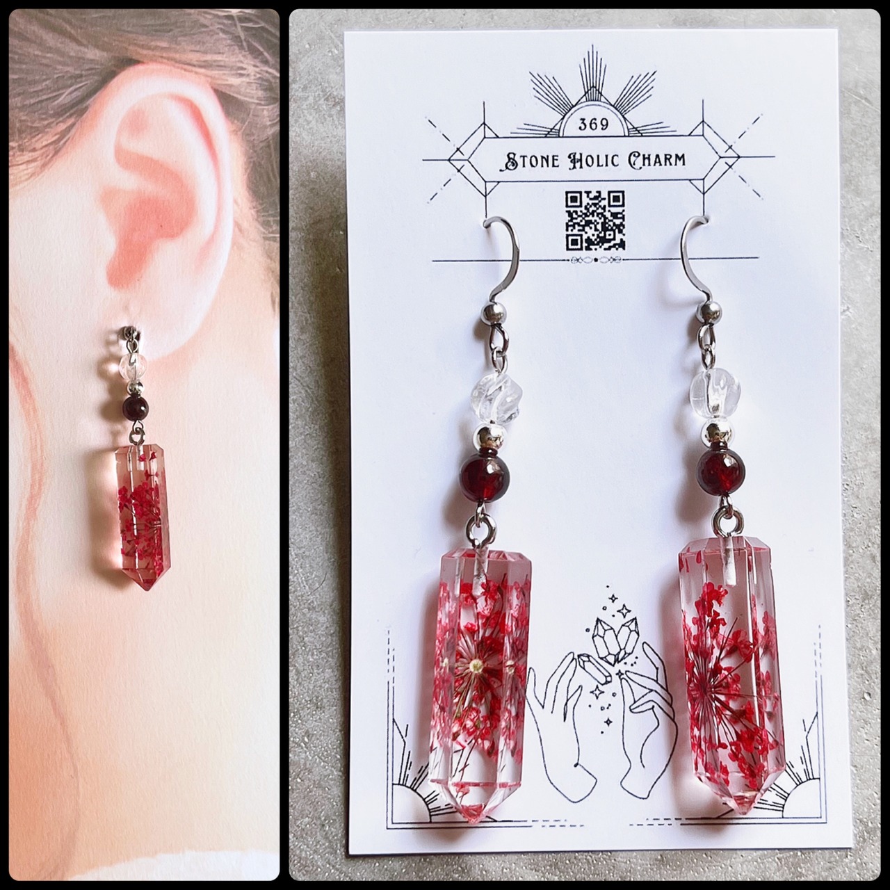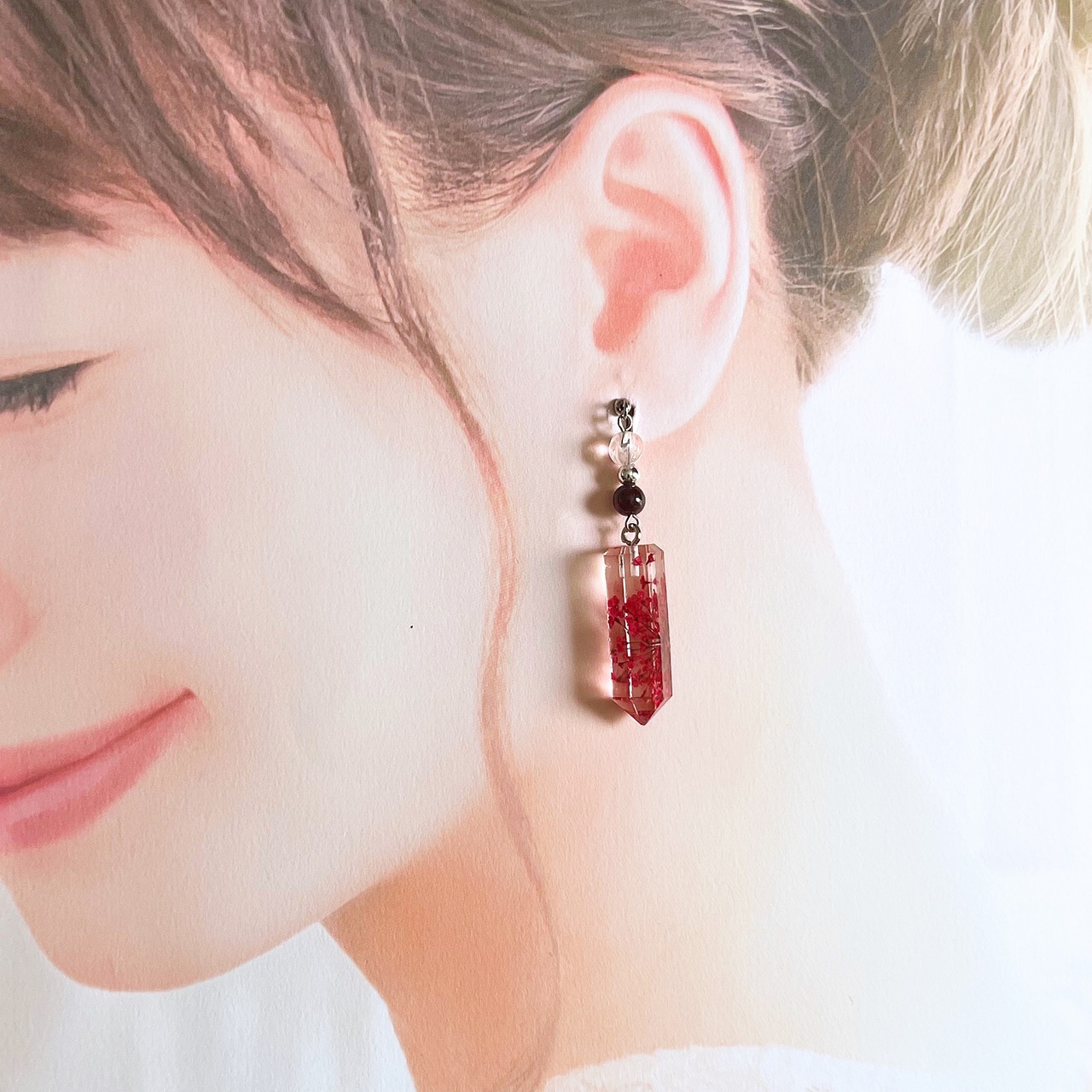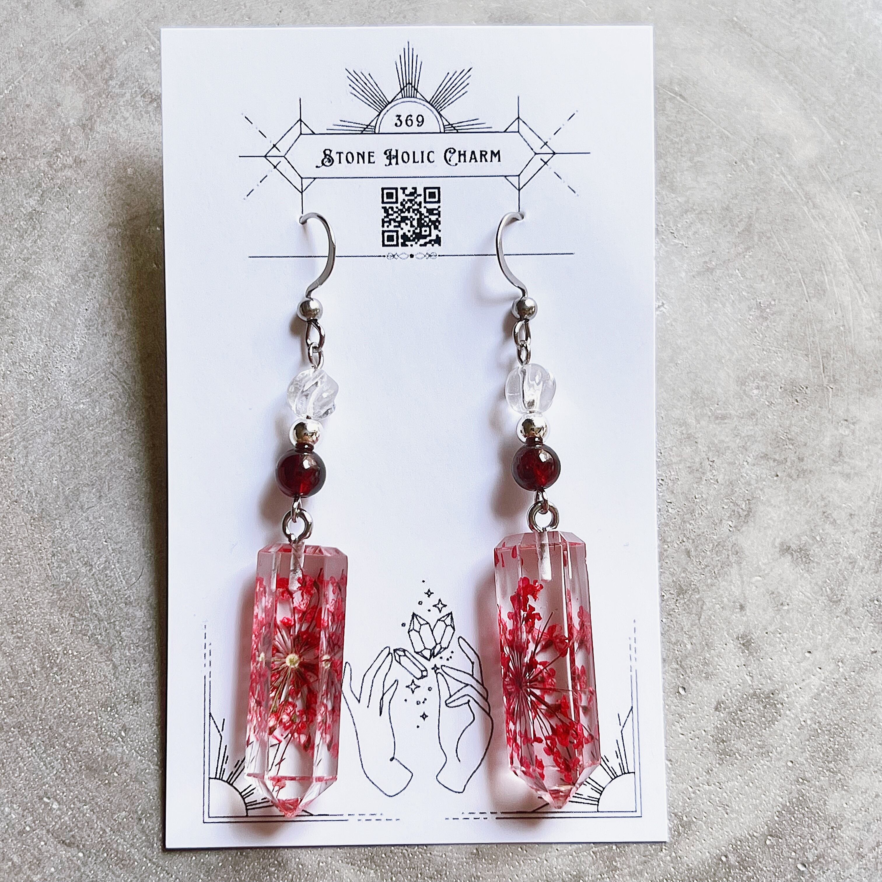水晶のポイント型レジンに赤い花が描かれているアジアンテイストなデザインです。