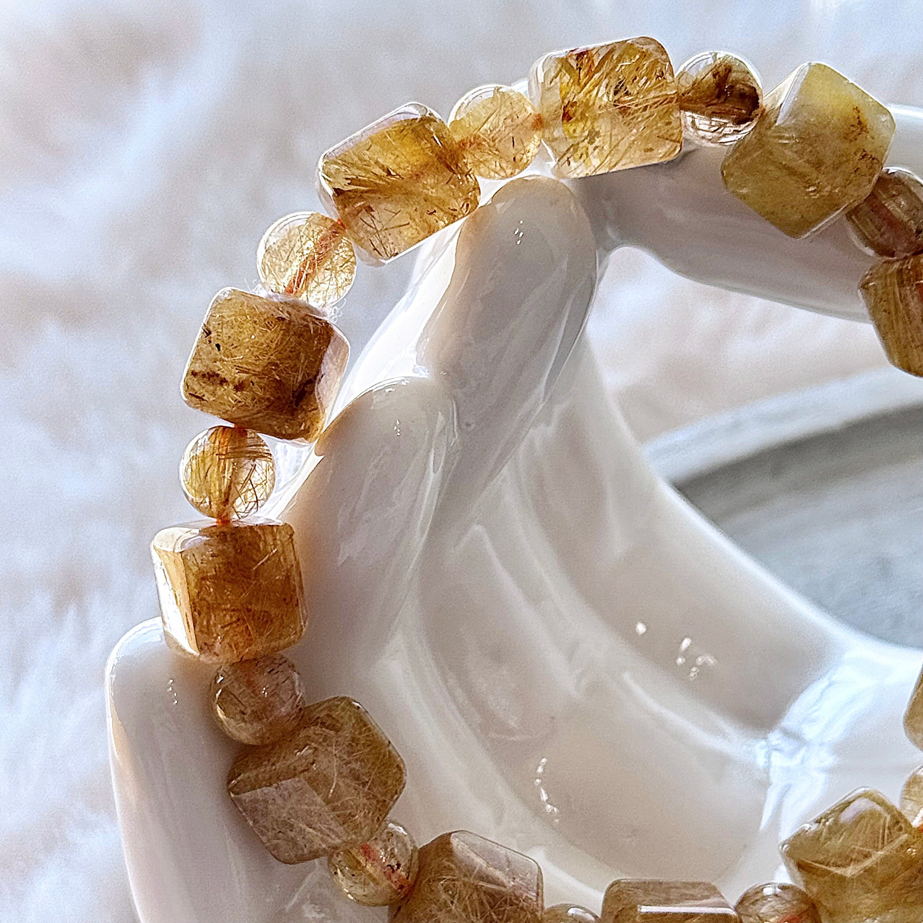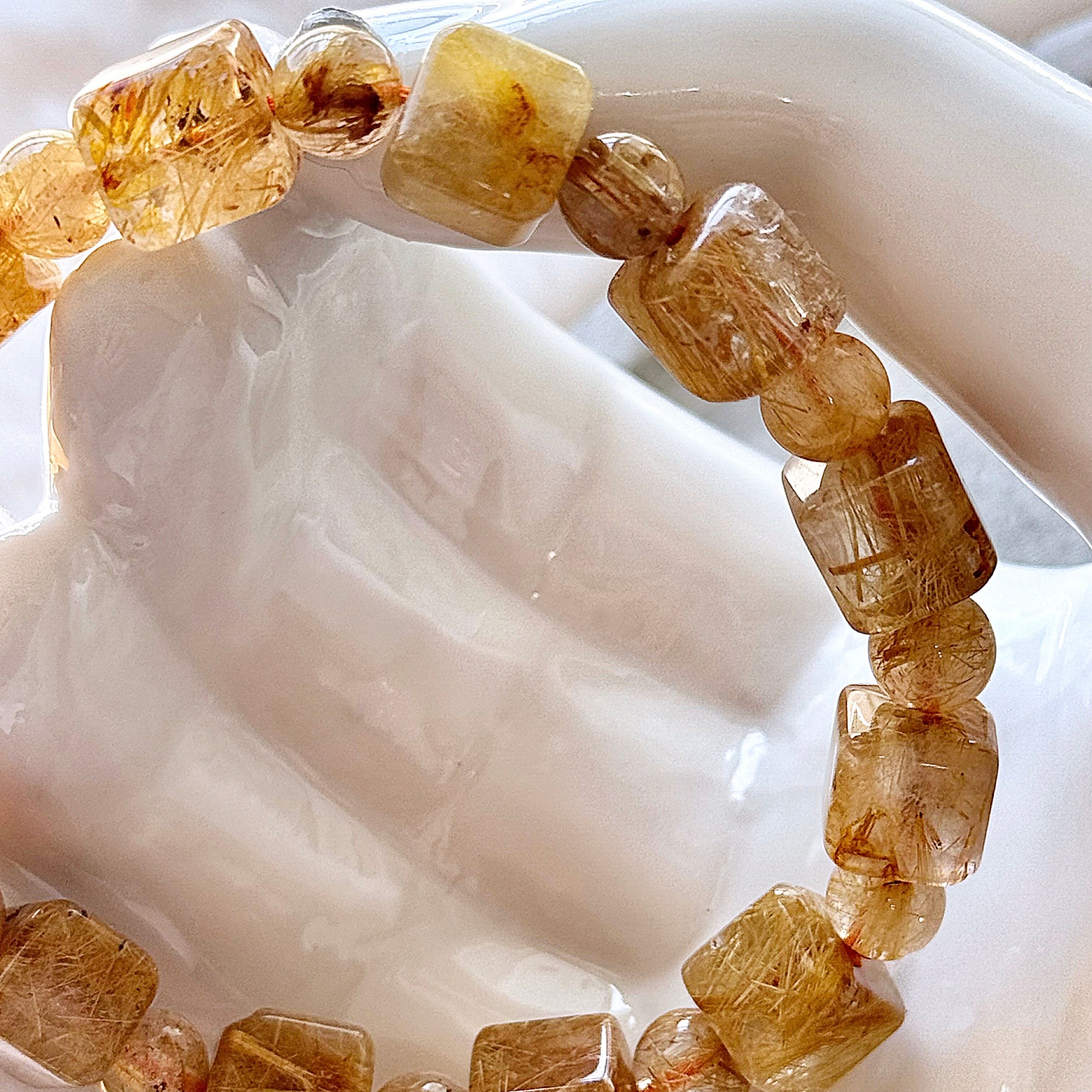 金運の最強の石、ルチルの金針がびっしり入ってるキューブカットのデザインブレスです。