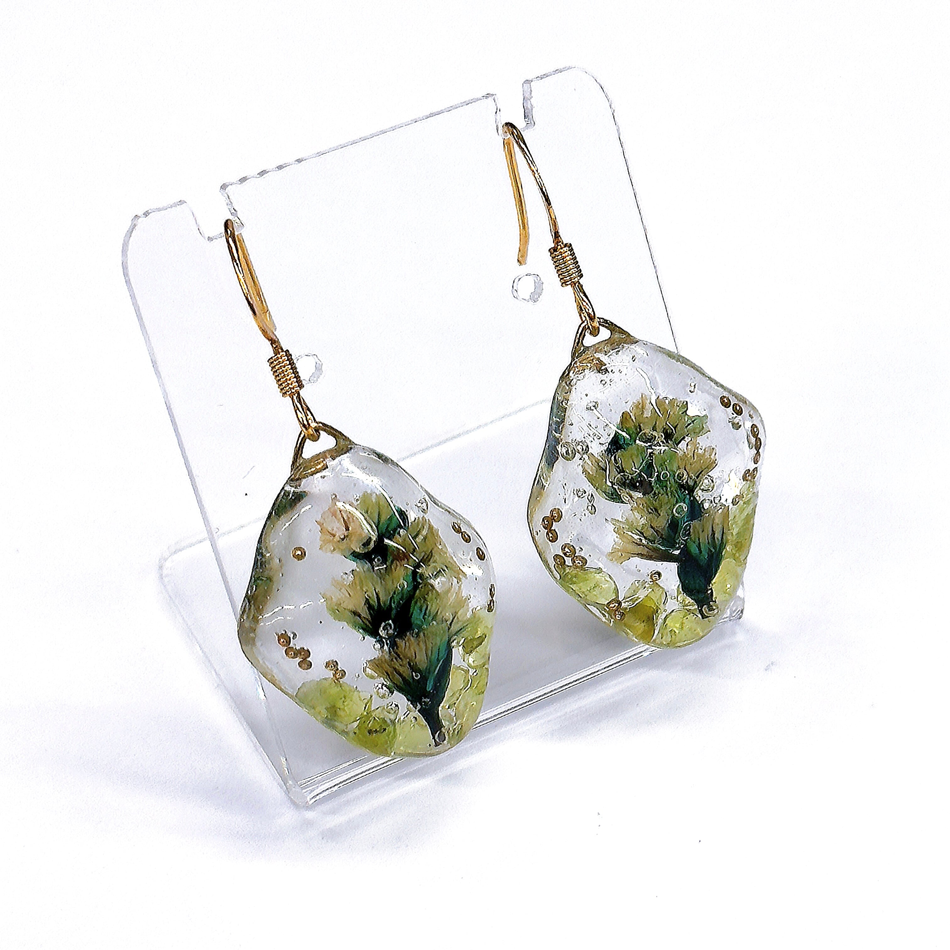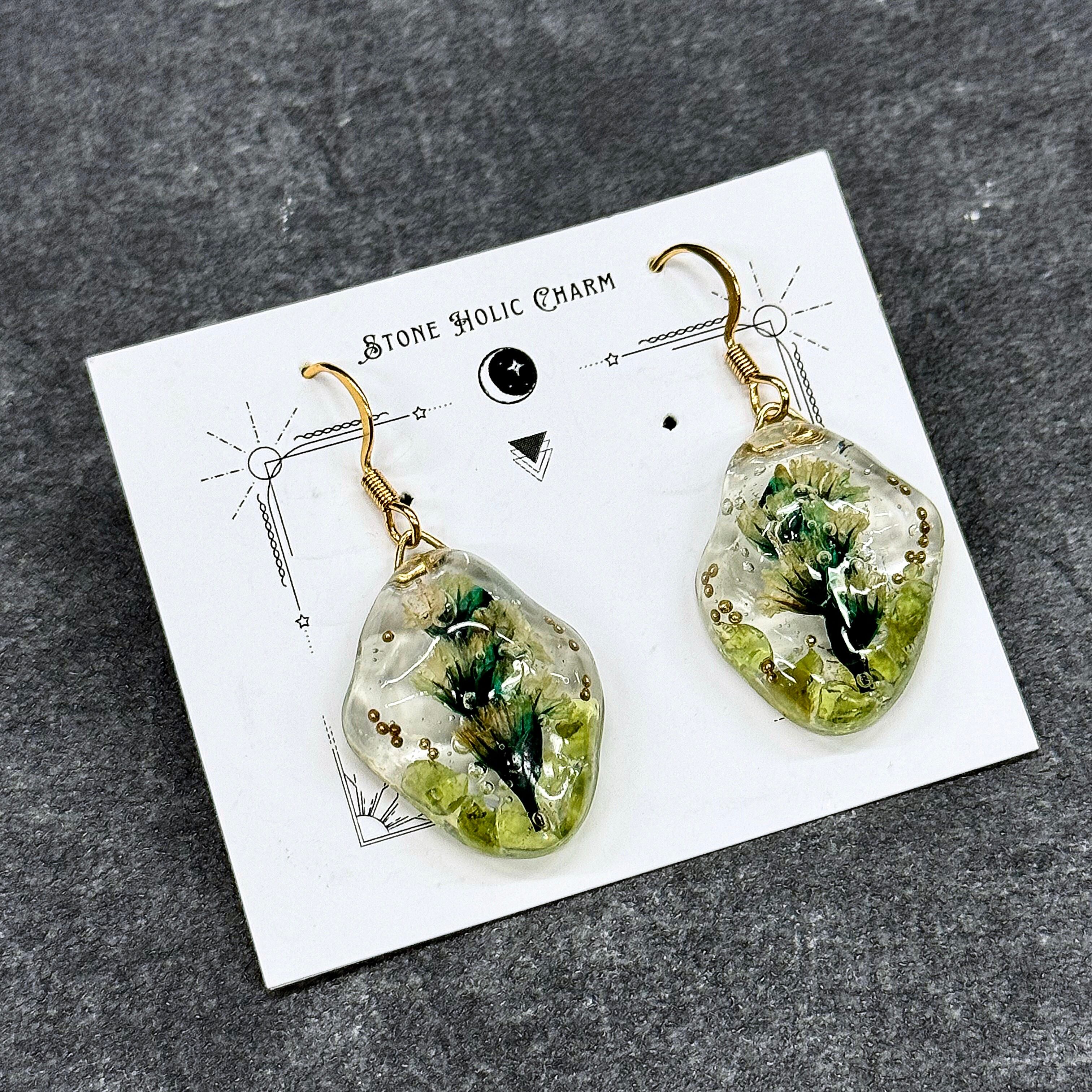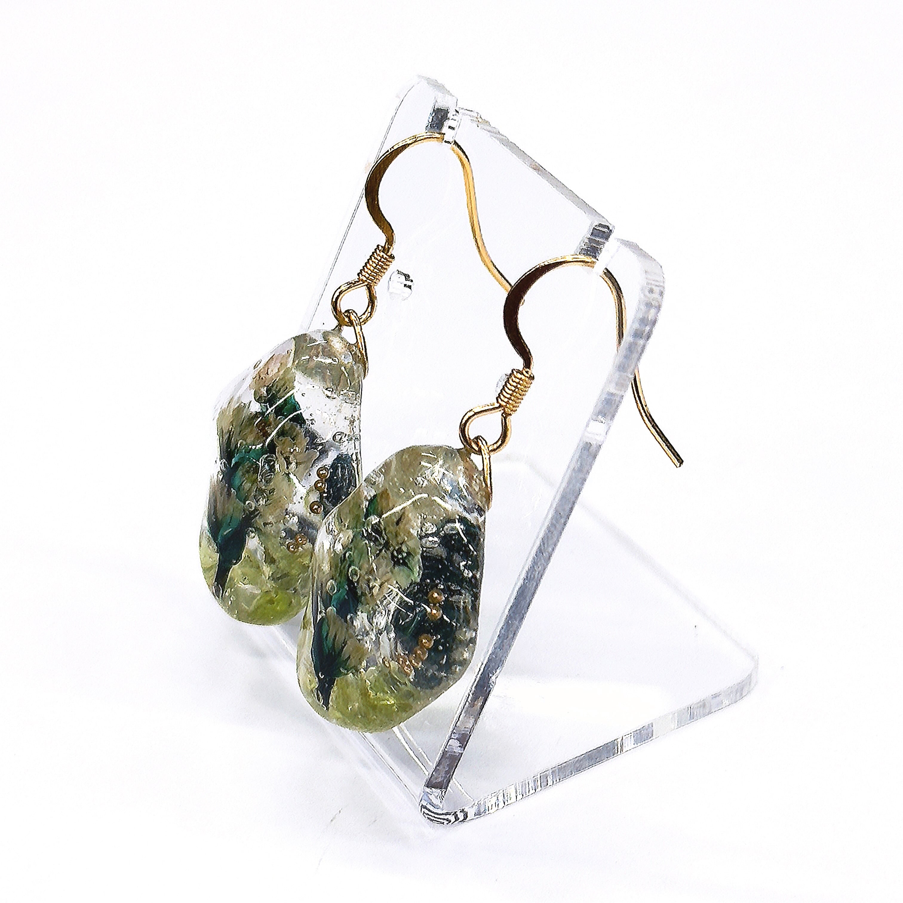 レジンでペリドットのさざれ石とカスミ草を閉じ込め水中花にしました。
