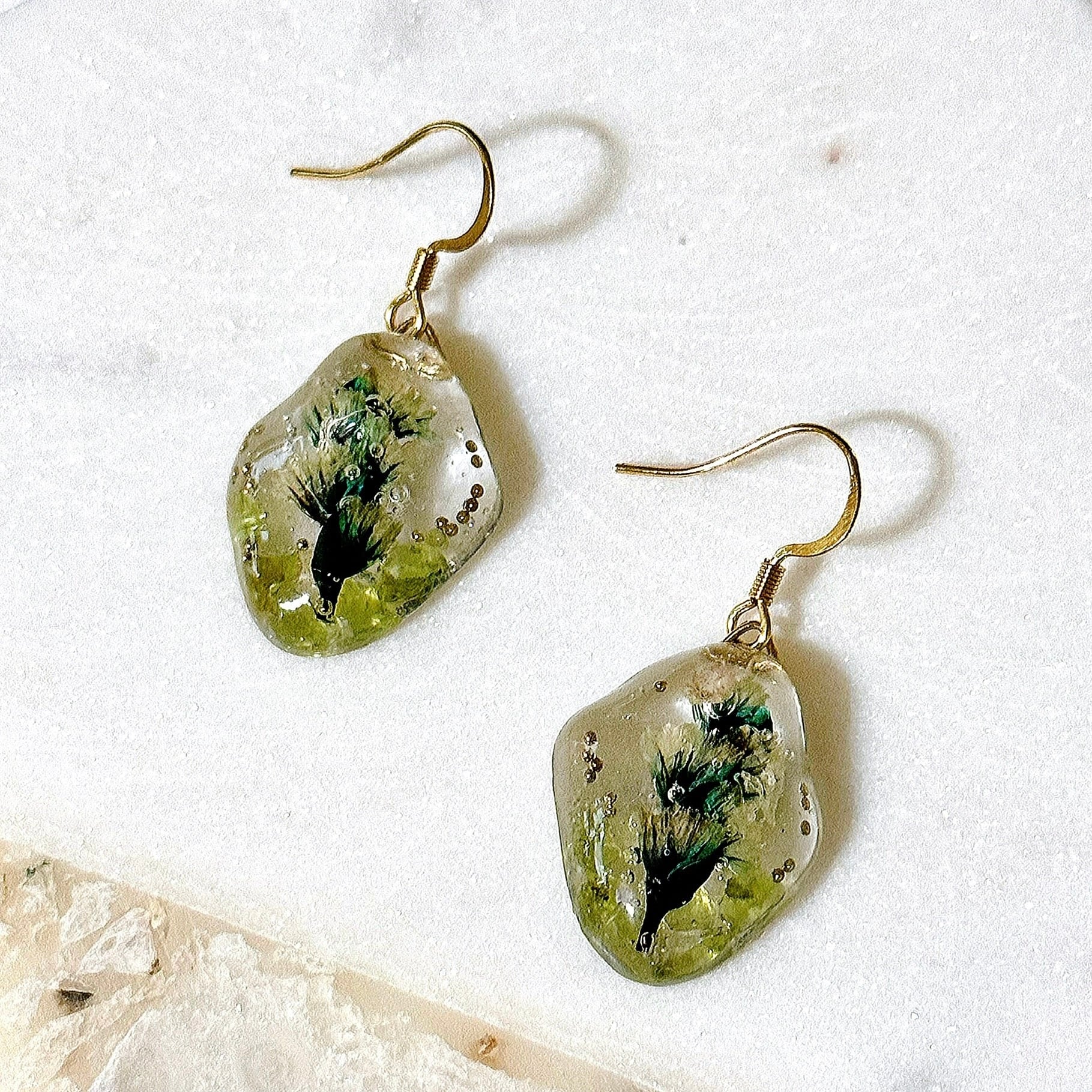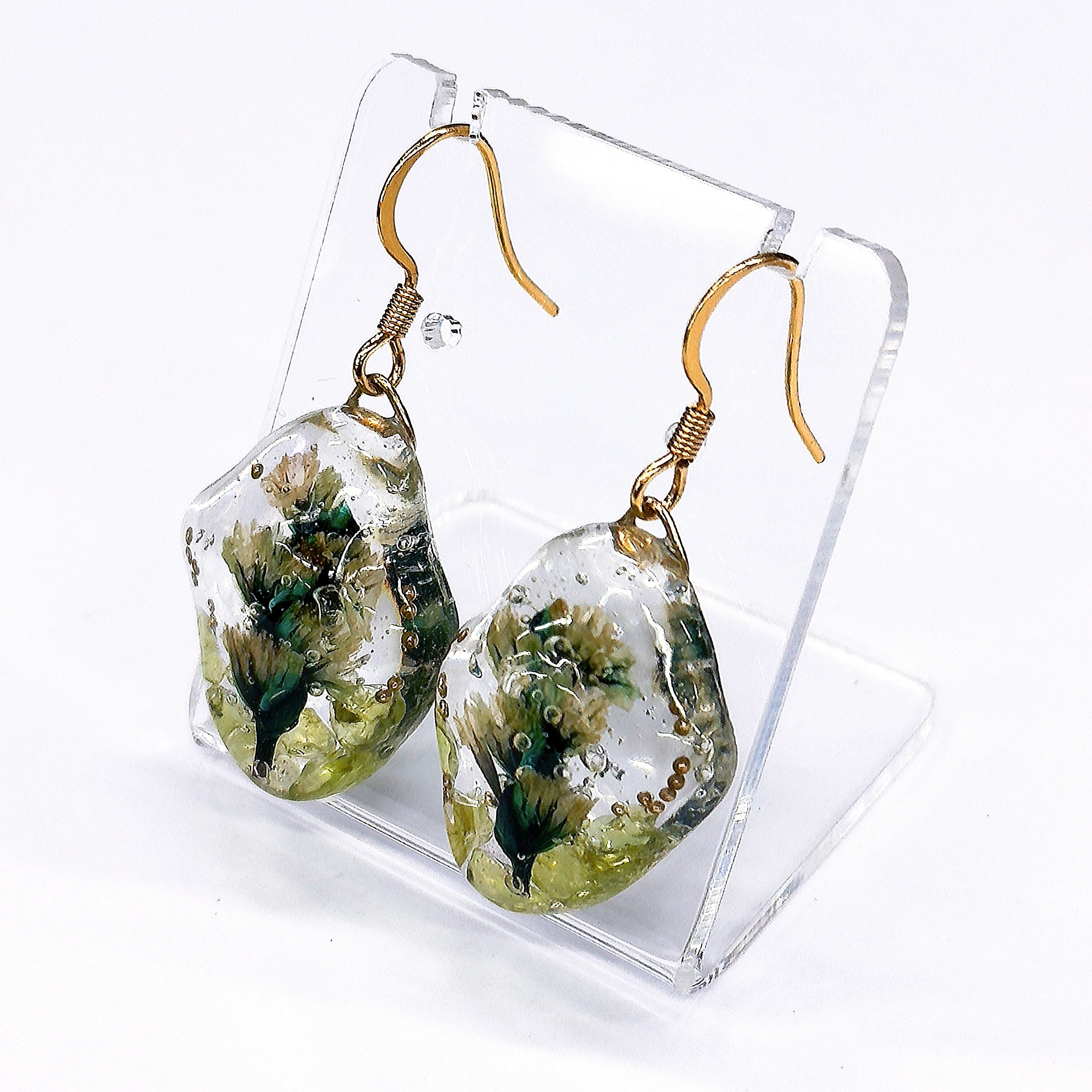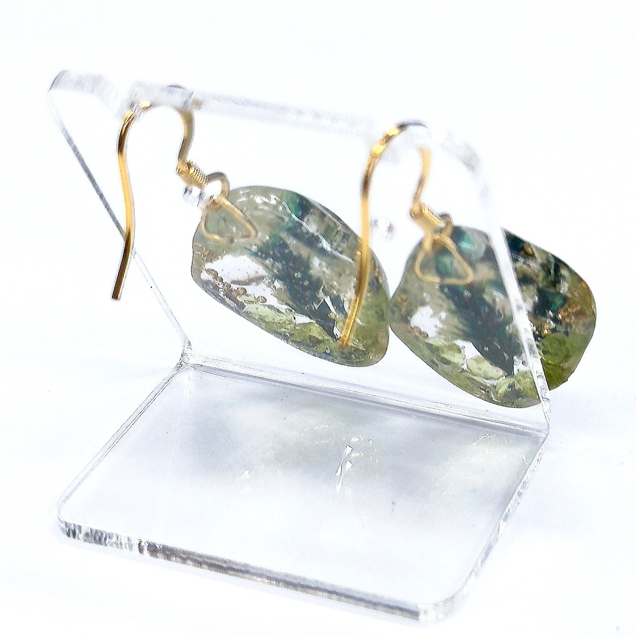 レジンでペリドットのさざれ石とカスミ草を閉じ込め水中花にしました。