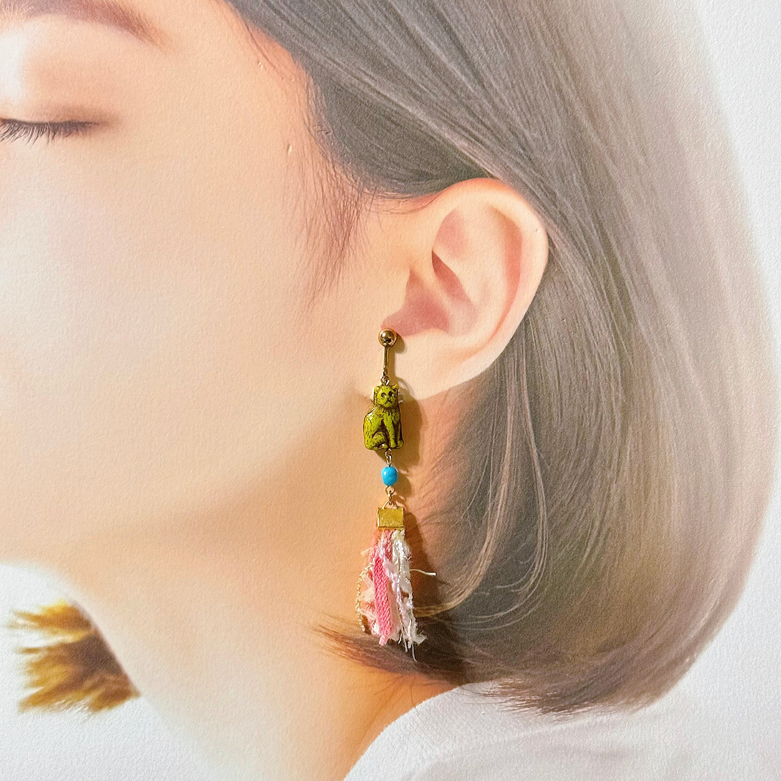 猫と魚のヴィンテージビーズを使った、個性的なカラフルフリンジデザイン