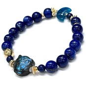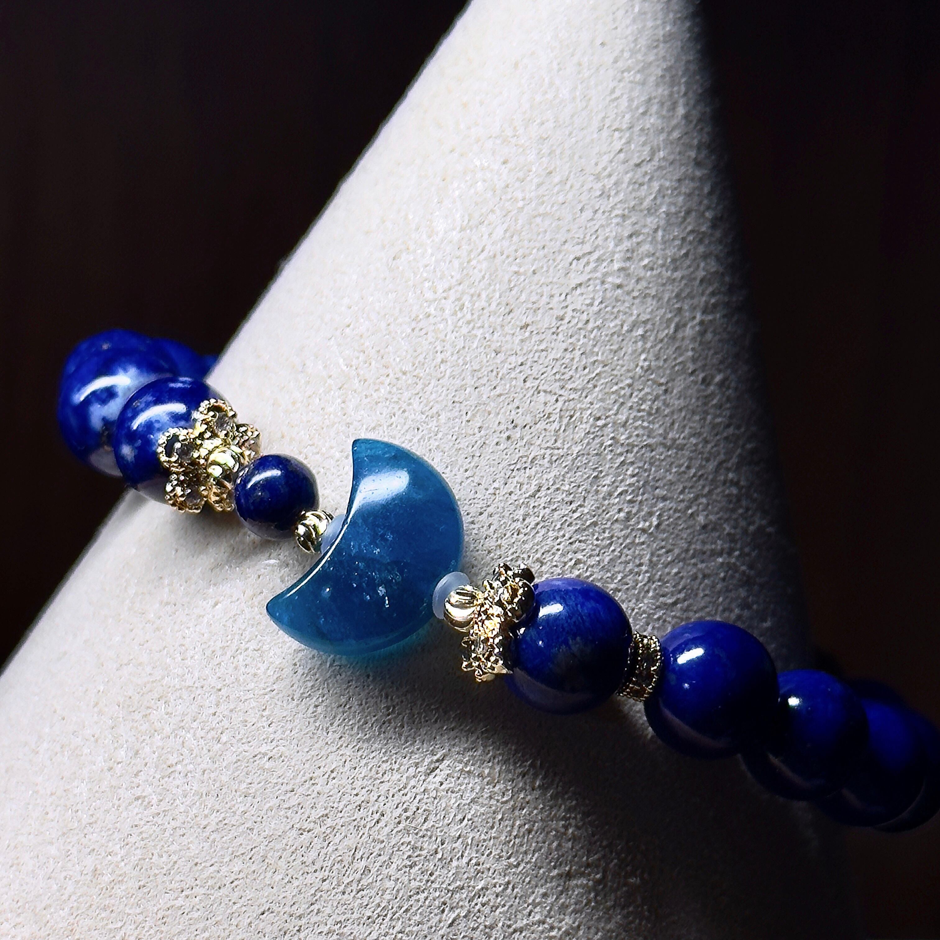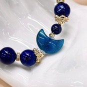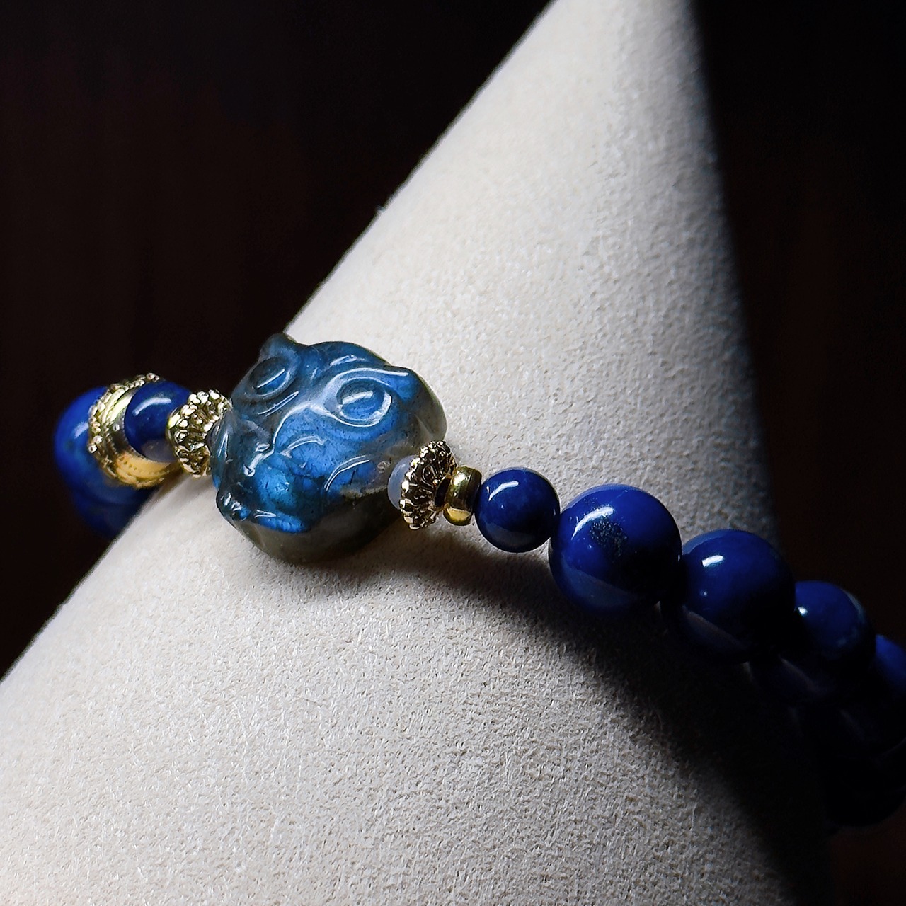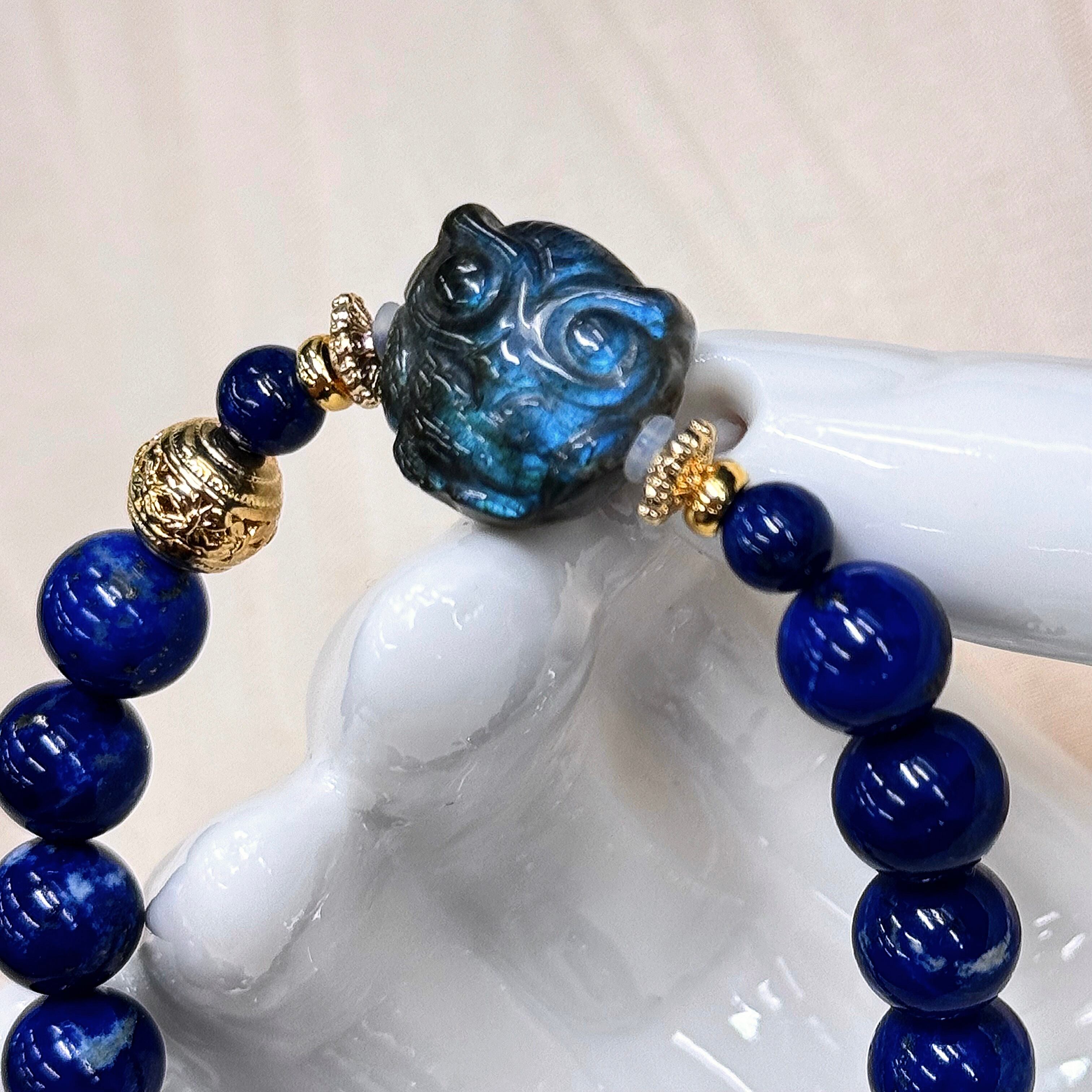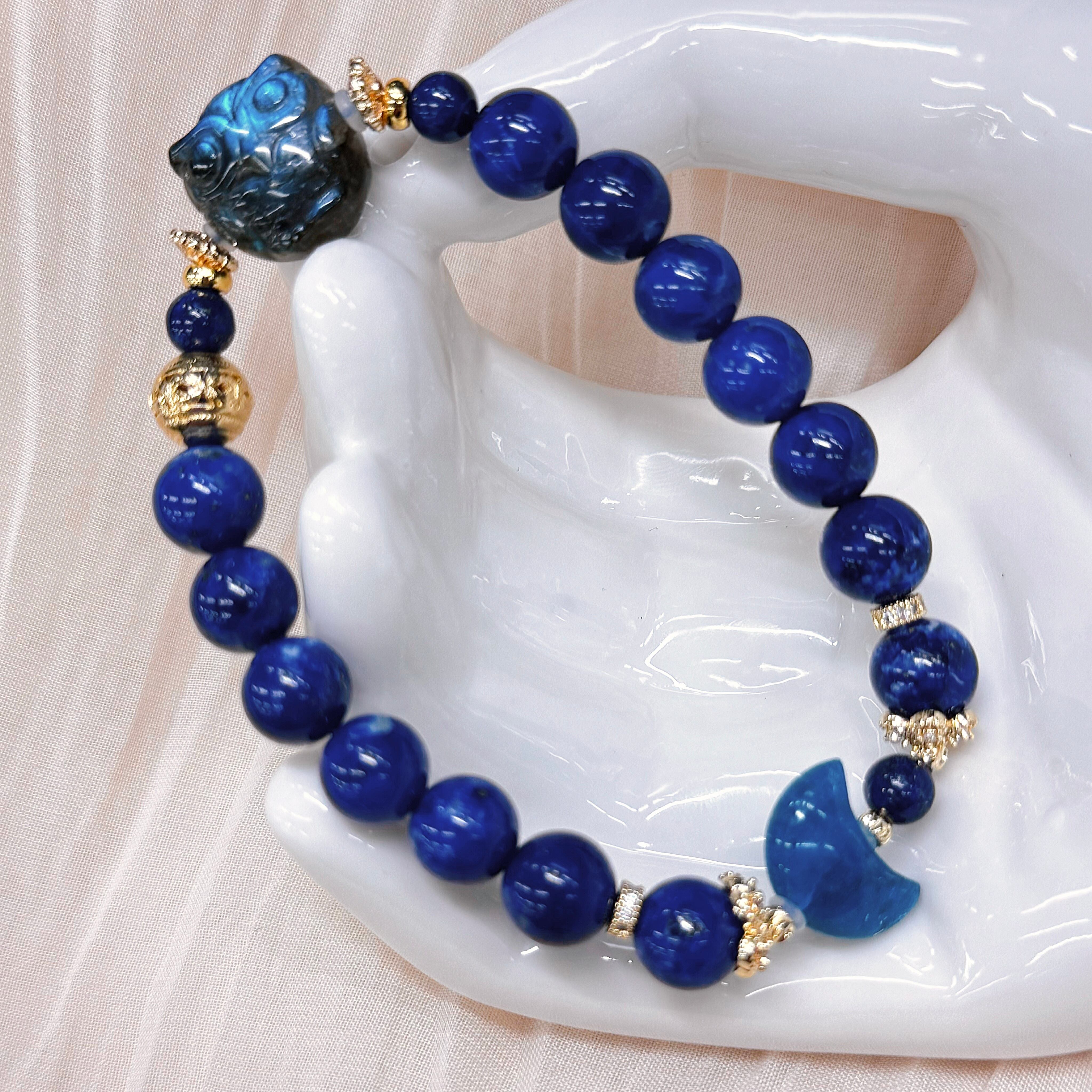 フクロウのラブラドライト、月のアパタイトをラピスラズリで紡いだデザインブレスレット