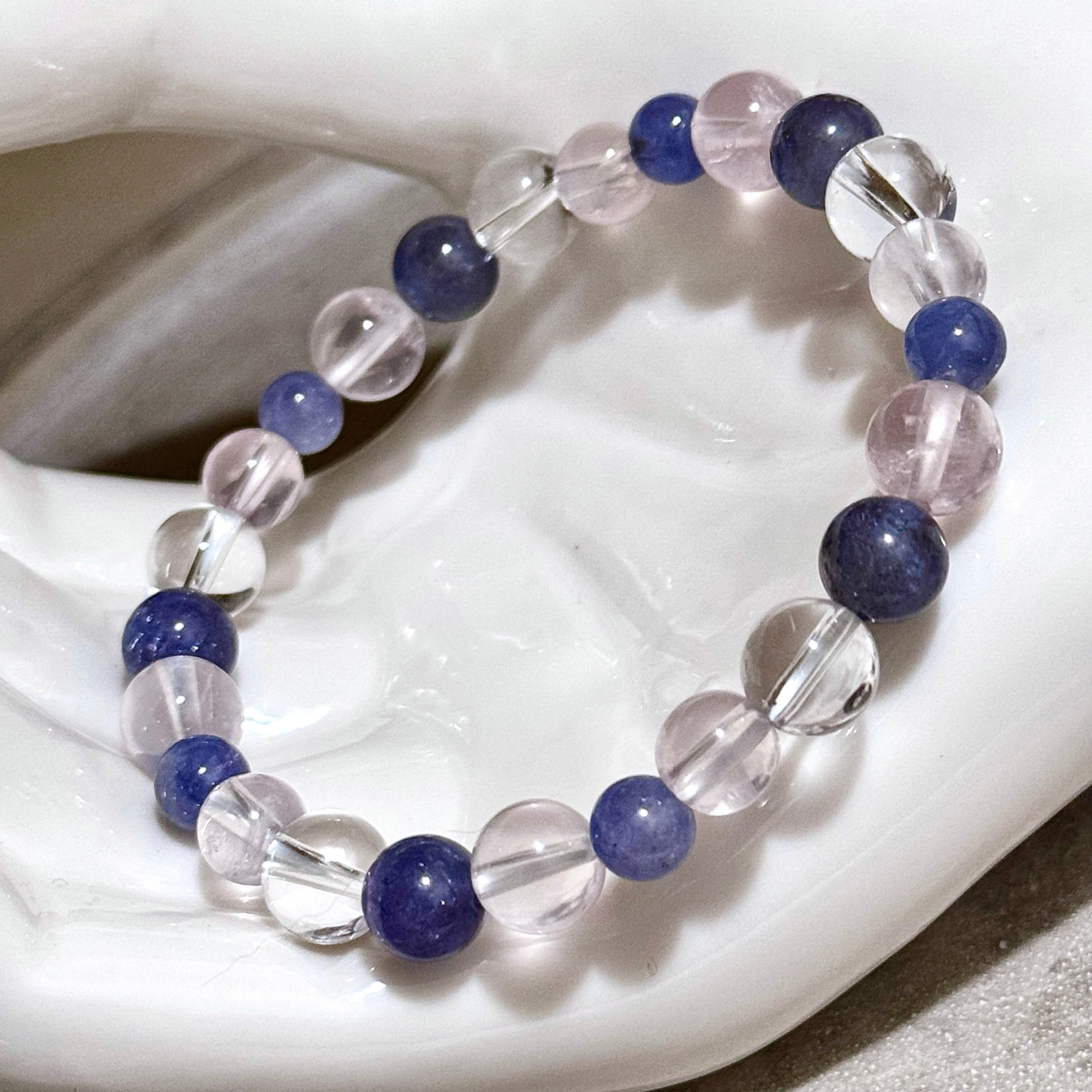 12月の誕生石、タンザナイトにローズクォーツ、そして水晶を組み合わせた特別なジュエリー。