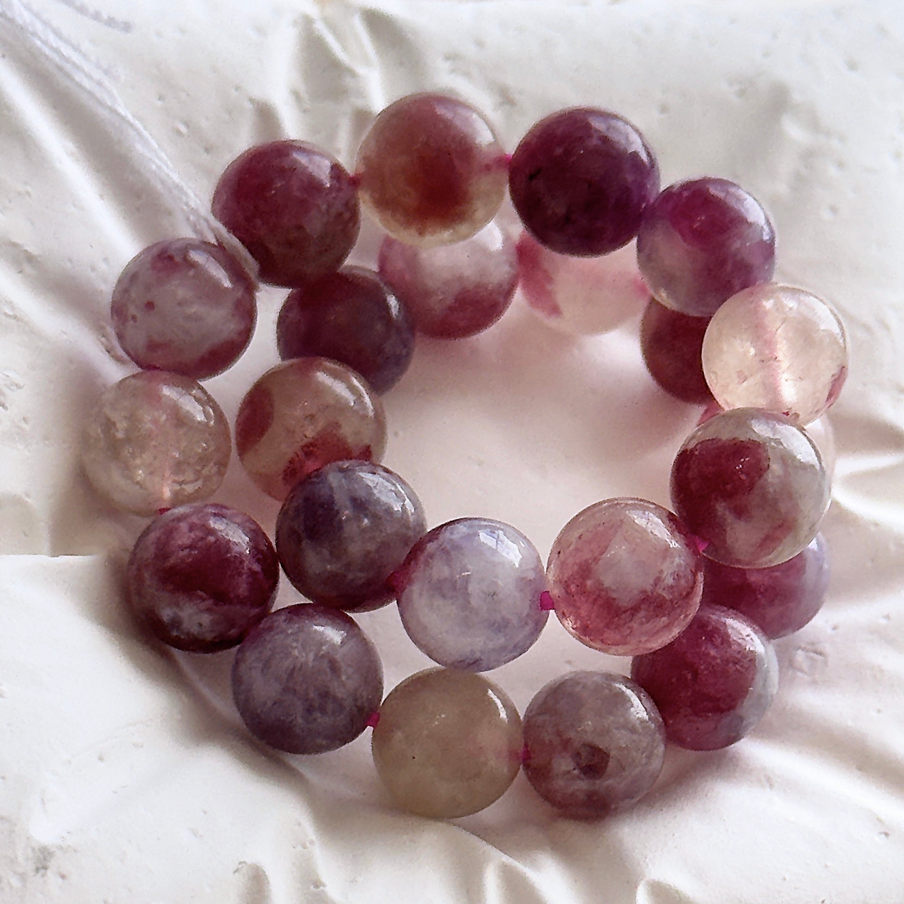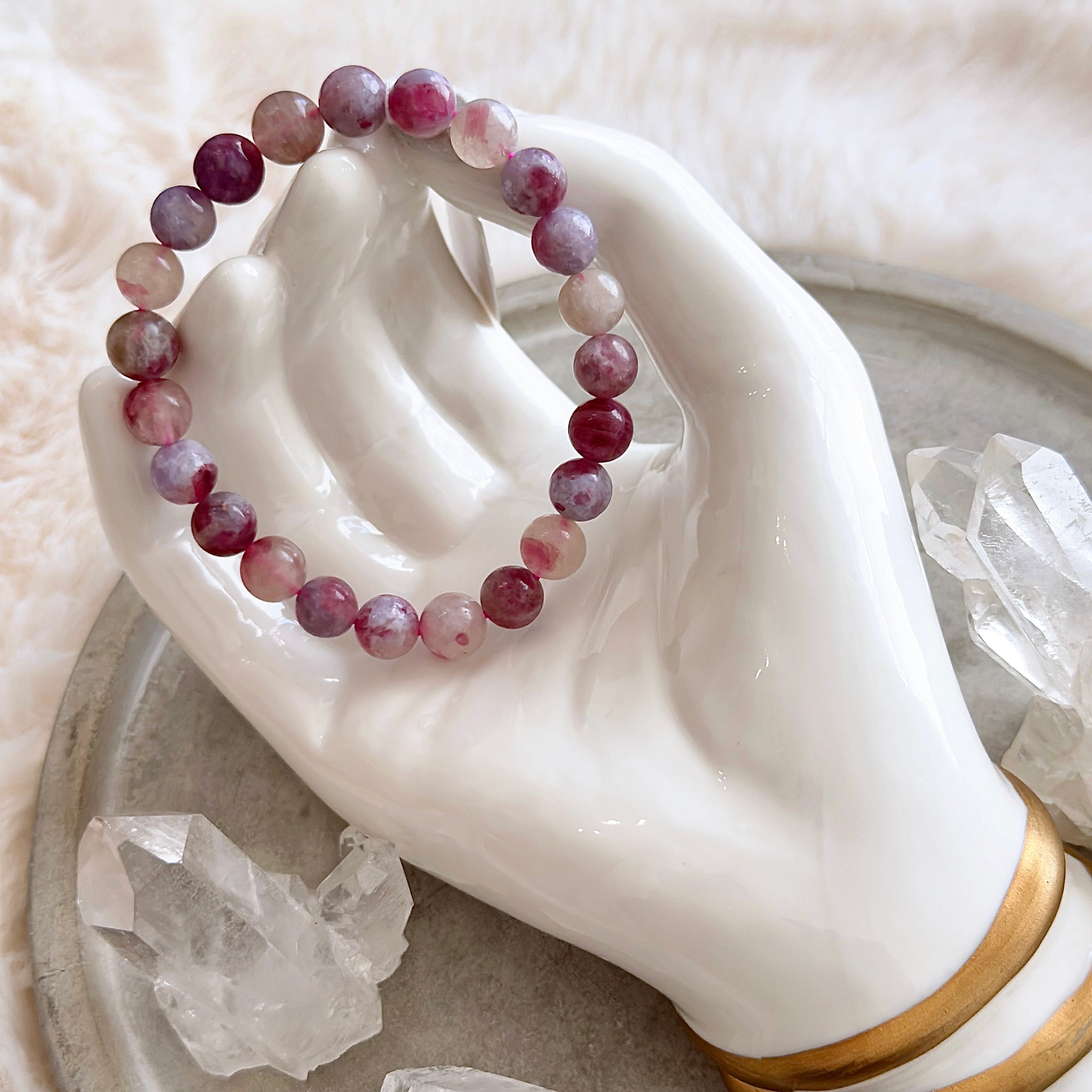 ピンクトルマリンと石英(水晶)の混合共存石で、自然に造り出されたピンクやパープルの水彩画のようなマーブル模様が魅力的です。